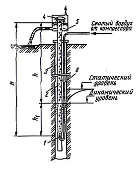 Воздушный водоподъемник (эрлифт) представляет собой опущенную в скважину 3 (рисунок 6) водоподъемную трубу 2, в которую с помощью форсунки 1 по трубе 6 подается сжатый воздух от компрессора. Образовавшаяся в трубе 2 воловоздушная смесь (эмульсия) поднимается к приемному баку 5 с водоотделителем 4, где воздух отделяется и уходит в атмосферу, а вода сливается по трубе в сборный резервуар, из которого насосами подается в сеть или водонапорную башню.