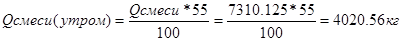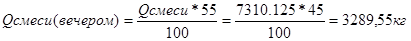 Учитывая распорядок дня, животных кормят два раза в сутки: утром и вечером. Утром выдается 55% корма, а вечером – 45%. Поэтому подбор машин проводим по утренней загрузке линии. Сейчас находим количество смеси, которое скармливается утром (55%) и вечером (45%) от общего количества смеси по формулам