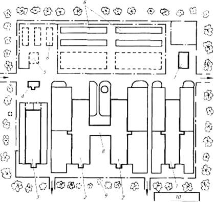 Рис. 1. Генеральный план фермы на 400 коров привязного содержания: 1 — здание для молодняка на 358 голов; 2 — коровники на 200 голов; 3 — телятник и родильное отделение на 60 стойл; 4 — автовесы; 5 — кормоцех; 6—склады кормов; 7—ветпункт; 8—переходная галерея; 9— жижесборник; 10— навозохранилище (за пределами комплекса)