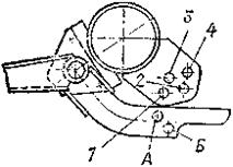 Рисунок 2 – Установка высотысреза у жатки комбайна: А, Б – отверстия в рычаге; 1…4 – отверстия в косынке. |