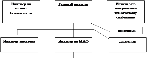 Данное хозяйство располагает следующей инженерно-технической службой ИТС. Во главе этой службы стой главный инженер, которому подчиняются инженер по ОТ и ТБ, по материально-техническому снабжению, энергетик, инженерно МЖФ, звено слесарей по МЖФ, заведующий ремонтной мастерской, кладовщик.