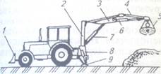 На раме погрузчика смонтирована колонка, в корпусе которой установлена поворотная труба 2. К верхней части колонки шарнирно прикреплена стрела З с надставкой 4. К стреле присоединяют сменные рабочие органы. Погрузчиком управляют с помощью рукояток гидрораспределителя из кабины трактора, обеспечивая заглубление грейфера, смыкание его челюстей, подъем и поворот стрелы, выгрузку удобрений в разбрасыватель или транспортное средство.
