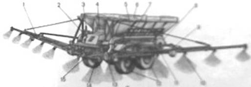 1, 9 – штанги; 2 – питатель-делитель; 3 – механизмы перемещения заслонок; 4 – заслонка; 5 – кузов; 6 – сетка;7 – воздуховод; 8 – вентилятор; 10 – распыливающий наконечник; 11 – труба; 12 – колеса; 13 – воздухораспределитель; 14 – траспортёр; 15 – туконаправитель