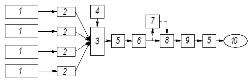 1 – коровник; 2 – групповой счетчик; 3 – молокосборник; 4 – вакуумная установка; 5 – молочный насос; 6 – очиститель молока; 7 – пастеризатор; 8 – охладитель; 9 – резервуар охладителя; 10 – молоковоз.