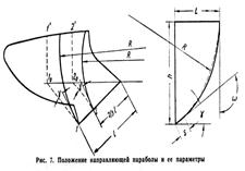 Направляющая кривая располагается нижней точкой на лезвии лемеха, верхней на верхнем обрезе отвала. В качестве направляющей кривой может быть использована окружность или парабола. Вылет направляющей кривой L и ее высоту h находят из уравнений