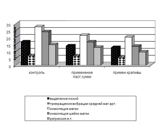 Выделение лохий у коров, которым двукратно вводили настой крапивы прекращалось, в среднем, к 13,00±0,38 суткам послеродового периода, что на 3 суток меньше, чем в контрольной группе (Р<0,001), а у коров, которым применяли настой пастушьей сумки, продолжительность лохиального периода составила 13,91±0,51, что меньше данных по контрольной группе на 2,91 суток (Р<0,01). Прекращение вибрации средней маточной артерии во второй опытной группе, где применялся настой крапивы фиксировалось на 6,36±0,36 суток, что достоверно меньше данных контрольной группы на 3,09 суток (Р<0,001). В то же время, в группе, где применялся настой пастушьей сумки, разница в результатах с контрольными животными составила 1,27 суток.
