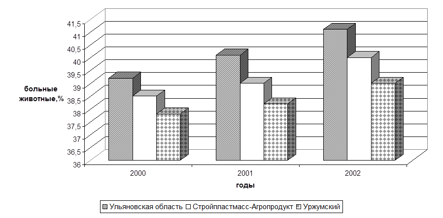 Как видно из таблицы 4 и рис. 1, в течение последних трех лет в курируемых нами хозяйствах увеличивается количество коров с акушерско-гинекологической патологией. Так, в ООО «Уржумский», где средняя молочная продуктивность коров составляет 3500-3800 кг, число заболевших животных составило 202 (38,5%) головы, то есть увеличилось на 0,7% за учетный период.