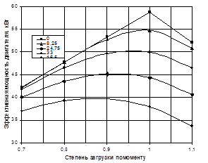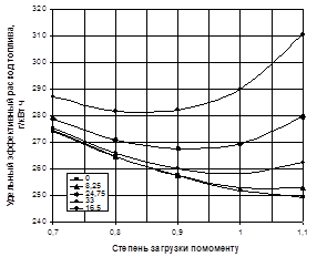 Рисунок - Зависимость эффективной мощности и удельного эффективного расхода топлива от степени загрузки и неравномерности момента сопротивления на входе в двигатель.