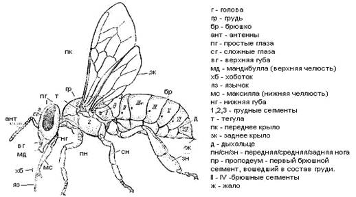 Тело рабочей пчелы, матки и трутня слагается из трех отделов - головы, груди, брюшка.