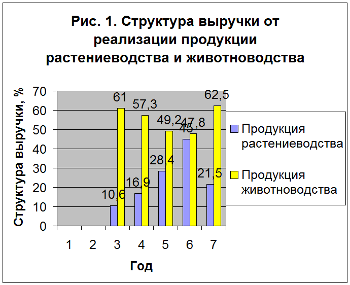 Не смотря на то, что продукция животноводства и преобладает в структуре выручки, но в период 1997-2000 гг. её удельный вес заметно сократился.
