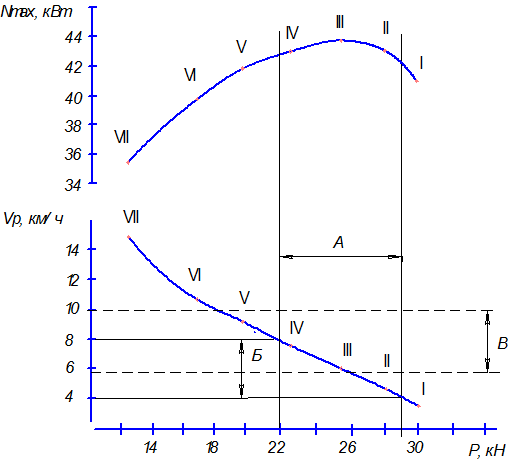 - за основную рабочую передачу принимают ту, на которой величина Nкр имеет наибольшее значение. При этом рабочая скорость движения Vp на данной передаче должна укладываться в пределы технологически допустимых скоростей движения;