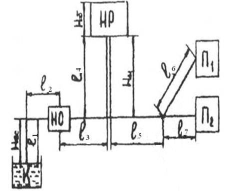 Рисунок 1 - Расчетная схема водопровода: К - колодец (источник воды); НС — насосная станция (водоподъемник); HP -напорно-регулирующее сооружение; П1, П2, П3 - потребители; ℓ1, ℓ2 - линия всасывающего трубопровода; ℓ3 - линия напорного трубопровода; ℓ5 ,ℓ6 ,ℓ7 - линия разводящего трубопровода; НВС - высота всасывания геометрическая (расстояние по вертикали между уровнем воды в источнике и осью насоса); Нб - высота бака; Нг - геометрическая разность нивелирных отметок земли у башни и наиболее высоко расположенной точки водопотреблення.