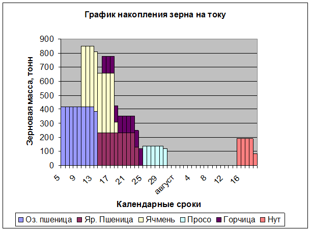 На основании нормативов продолжительности уборки и нормативов производительности имеющейся в хозяйстве уборочной техники при различной урожайности той или иной с.-х. культуры, а так же с учетом календарного распределения уборочно–транспортных звеньев по убираемым массивам заполняется таблица максимально возможного в данном хозяйстве суточного поступления зерна на ток (табл. 5), и на её основании строится соответствующий график.