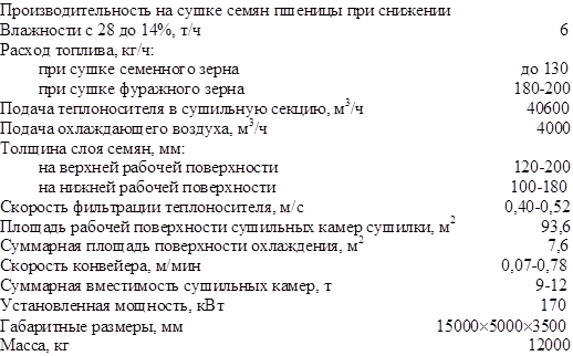 Сушилка работает следующим образом. Семена из надсушильного бункера самотёком поступают в начало верхней решетной поверхности и цепочно-планчатым конвейером распределяются равномерным по толщине слоем по обеим решетным поверхностям. Толщина слоя семян устанавливается заслонкой надсушильного бункера. Теплоноситель, нагнетаемый вентилятором под нижнюю решетную поверхность, проходит через отверстия в ней и слой семян, промежуточную камеру, через отверстия верхней решетной поверхности и слой семян и выходит из сушильной камеры. На верхней решетной поверхности происходит нагрев и подсушка семян, на нижней решетной поверхности – сушка до кондиционной влажности. Часть нижней решетной поверхности используется для частичного охлаждения высушенных семян. Сушка семян в потоке (режим: загрузка – выгрузка) обеспечивается за счёт регулировки толщины слоя и скорости движения конвейера. Эти же регулировки позволяют добиться полного использования влагопоглотительной способности теплоносителя.