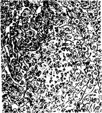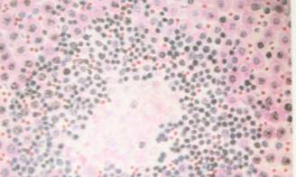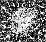 Рисунок: некротический очажок, окруженный лимфоидными клетками в печени теленка (окраска гематоксилин-эозином)