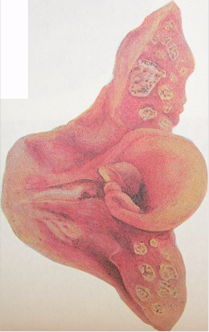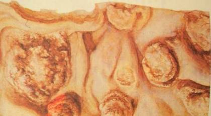 Первоначально здесь находят острое набухание лимфатического аппарата, в этот период места поражения выступают в просвет кишечника в виде валиков (пейеровы бляшки) или полушаровидных возвышений (солитарные фолликулы).