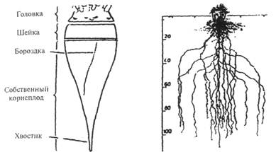 Корневая система состоит из главного корня, боковых корней и корневых волосков. Мочковатая корневая система, которая имеет решающее значение для поглощения воды и питательных элементов, находится на глубине почвы до 25 см. К концу вегетации в этом слое сосредоточено до 60-80% этих корней, глубже 1,5 м - примерно 10% (рис. 3). Корни весной сначала медленно развиваются, однако ко времени смыкания рядков они уже достигают общей длины 10- 15 м/м2 площади и глубины 1 м. До конца вегетации в зависимости от почвы могут проникнуть на глубину 1,2-3 м и достигать общей длины 10- 15 км/м2.