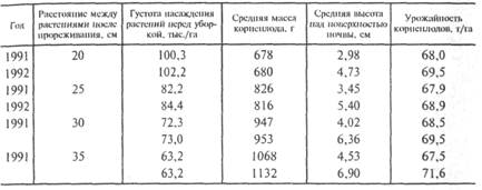 Таблица 1. Зависимость величины корнеплода и его средней высоты* над поверхностью почвы от расстояния между растениями и года возделывания