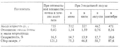 Если вегетацию растений свеклы (с 15 мая до 15 октября) подразделить на три периода (по 50 дней), то соотношение расхода воды на испарение в каждом из них составит примерно 1:9:3. Недостаток влаги в любой из этих периодов отрицательно сказывается на урожайности свеклы. Однако больше всего снижается урожай корнеплодов и их сахаристость, когда растения подвергаются действию засухи, - в июле-августе. Это положение наглядно подтверждается результатами исследований Мироновского научно-исследовательского института селекции и семеноводства пшеницы (табл. 2).