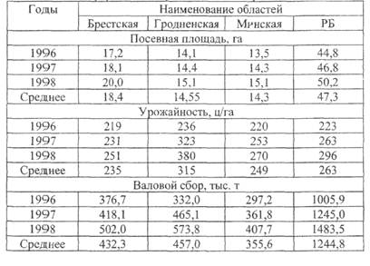 Начиная с 1992 г. данная культура выращивается в Витебской, Гомельской и Могилевской областях, где она занимает незначительные площади: с 1992 по 1998 г. в хозяйствах всех категорий этот показатель колебался от 0.1 до 1.0 тыс. га. В то же время нестабильны размеры посевных площадей в областях традиционного свеклосеяния (Брестской, Гродненской, Минской): с 1991 по 1994 г. они расширялись, а с 1994 по 1996 сокращались. В целом по республике посевы сахарной свеклы уменьшились с 57.6 тыс. га в 1994 г. до 44.8 тыс. га в 1996 г. и в 1998 г. посевные площади составили 50.2 тыс. га.