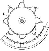 Рис. 1. Схема молотильного аппарата с зубовыми бичами: 1 – барабан; 2 – подбарабанье