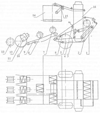 Рис. 4. Схема картофелеуборочного комбайна КПК-3: 1 – шнек задний; 2 – горка; 3 – ходовые колеса; 4 – экран ботвоудалителя; 5 – редкопрутковый транспортер ботвоудалителя; 6 – элеватор второй; 7 – шнеки боковые; 8 – шнек центральный; 9 – основной элеватор; 10 – лемех; 11 – шнек продольный; 12 – диски выкапывающие; 13 – катки опорные; 14 – бункер-накопитель; 15 – загрузной транспортер; 16 – ковшовый транспортер