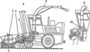 а — базовая модель; б - сменный измельчитель и швырялка КСК-100А; 1 — режущий аппарат; 2 - мотовило; 3 — шнек; 4, 11, 12 — передние вальцы;