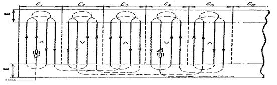 На рассматриваемой нами пахоте наиболее эффективным способом является петлевой с чередованием загонов всвал и вразвал. Сначала обрабатывают первый и третий загоны всвал, затем второй загон вразвал, после этого обрабатывают пятый загон всвал, четвертый вразвал и т. д., т. е. очередность вспашки загонов: 1-3-2-5-4-7-6 и т.д.