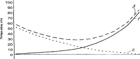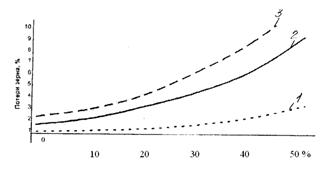 Рис. 2. Потери зерна за жаткой (1), молотилкой (2), суммарные (3).