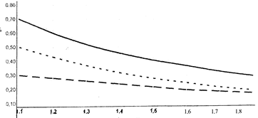 Из графика видно, что в данных условиях с уменьшением соотношения скоростей потери свободным зерном снижаются. Это снижение тем значительнее, чем выше скорость комбайна. При скорости равной 1,08 м/с, потери уменьшились с 0,7% (при VK / Vпл=0,69) до 0,3% (при VK / Vпл=0,55) с увеличением скорости комбайна изменение соотношения в указанных пределах менее существенно влияет на потери свободным зерном.