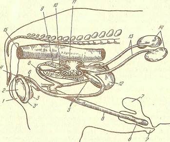 I– мошонка; 2 – семенник (правый); 3 – тело придатка семенника; 3 - головка придатка; 4 – хвост придатка; 5 – спермопровод; 6 – начало спермопровода; 7 – препуций; 7 -дивертикул препуция; 8 – половой член; 9– луковичные (куперовы) железы; 10 – предстательная железа; 11– пузырьковидные железы; 12 – мочевой пузырь; 13 – мочеточники; 14–почки; 15 – прямая кишка.