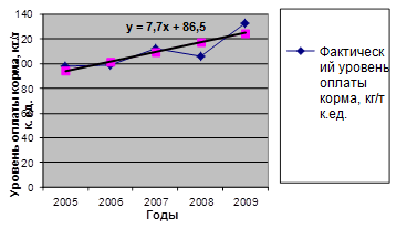 Таблица 2.2. Фактический и выровненный уровень оплаты корма (кг/т к.ед.) в сельскохозяйственной организации за 2005 – 2009 г.г.