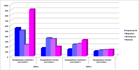 Импала в условия 2008 года способствовали увеличению массы клубней с одного растения. Импала имея большую массу клубня имеет меньшую массу ботвы, а Беллароза имея самую меньшую массу клубней с 1 растения и довольно мощную ботву. Беллароза имея довольно мощную биомассу должна была показать хорошую урожайность, ко вероятно если бы были благоприятные по комплексу факторов условия то максимальная урожайность была бы позже. Стандарт был вторым сортом по массе клубне с 1 растения а ботва была самой низкой из сортов, т.е. Импала и спринтер те сорта пригодные для выращивания в летней посадке и получения хорошего урожая.