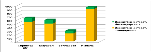 Изучаемые нами сорта имели большой процент стандартных клубней в среднем 80-90% (2008 г), условия 2009 года способствовали накоплению больше нестандартной продукции, но э,-о данные на 7 июля. Нестандартные клубни превышали выход стандартных.