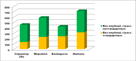 Прибавка урожая на сорте Импала составила 4 т на га по сравнению со Стандартом а сорта Мирабел и Беллароза снизили урожайность соответственно на 2,3 и 6,6 т на гав среднем за 2 срока наблюдения (летней и весеннее посадке) отличие по урожайным данным между датами посадок незначительны (13,1 и 13,4 т/га) результаты весенней посадки показали, что общие закономерности соблюдались если сравнивать с летней посадкой.