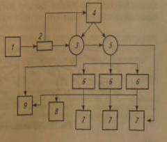 1-приемный бункер; 2-транспортер; 3 - устройство для очистки клубней от примесей; 4 - бункер-накопитель; 5 - устройство для разделения на фракции; 6 - переборочные столы; 7 - бункеры для фракций; 8-бункер камней и почвенных комков; 9-лотки для отходов