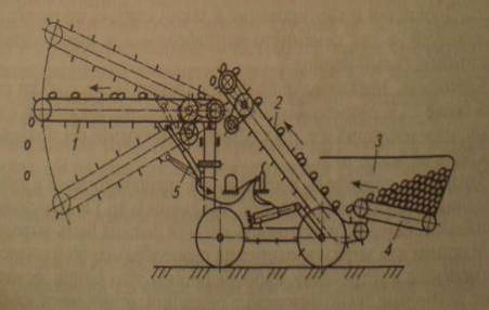 Рис.4 Транспортер-загрузчик ТЗК-ЗО: 1-стрела; 2-подъемный транспортер; 3 - бункер; 4-приемный транспортер; 5-стрела загрузчика транспортеру поступают в приемный бункер 3, затем подъемным транспортером 2 подаются для закладки на хранение. Стрела загрузчика меняет свое положение с помощью гидроцилиндра в пределах 0,3.5,5 м в зависимости от высоты загрузки.