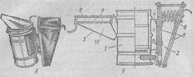 В нижней части дощечки, обращенной к корпусу, сделано отверстие для воздуха. Такое же отверстие напротив отверстия и дощечке имеется и в металлическом корпусе. Сверху корпус закрывается шарнирно укрепленной на нем крышкой, состоящей и обоймы в, решетки и патрубка с отверстием для выхода струй дыма. Патрубок гасит искры, образующиеся при сгорании горючего материала в дымаре. Внутрь корпуса вставляется металлический стакан, решетчатое дно которого не соприкасается с основанием корпуса, а опирается кромкой на выступы нижнего ободка корпуса. Двойная стенка корпуса предохраняет руки пчеловода от ожогов при длительном пользовании дымарем. На дно стакана укладывают мелкую стружку, сухой торф или другой материал, выделяющие при сгорании много дыма. Удобны для этой цели специальные брикетики. Струей воздуха, поступающей из меха, дым прогоняется через верхнюю часть корпуса и патрубок крышки и выходит наружу. Не следует использовать деревянные чурки, смолистые стружки, сухие ветки и другой материал, дающий при сгорании много жара, что быстро приводит к порче дымаря. Кроме того, пользование дымарем в таких случаях небезопасно в противопожарном отношении.