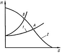 Режим работы вихревого насоса определяется точкой А (рис. 8) пересечения характеристики насоса (кривая 2) и характеристики сети (кривая 1). Наиболее распространенным способом изменения рабочего режима вихревого насоса является регулирование дросселированием, при котором изменение режима осуществляется изменением открытия регулировочной задвижки, установленной на напорном трубопроводе, в результате чего изменяется характеристика сети. Чтобы уменьшить подачу от QA до QB, надо прикрыть регулировочную задвижку настолько, чтобы характеристика сети прошла через точку В. При уменьшении подачи насоса дросселированием потребляемая мощность возрастает (см. характеристику насоса), поэтому регулирование вихревого насоса экономически невыгодно.