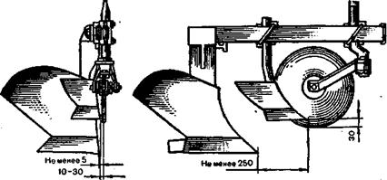 Предплужники устанавливают на раму плуга так, чтобы расстояние между носком лемеха предплужника и носком лемеха основного корпуса было 25–30 см, а высота установки предплужников обеспечивала глубину их погружения в почву на 8–12 см при любой глубине хода основного корпуса. Установку предплужников регулируют перемещением хомута вдоль грядиля рамы, а по высоте – перестановкой ограничительного болта высоты или изменением положения выступа державки в углублениях на стойке. Предплужник и дисковый нож устанавливают относительно основного корпуса согласно схеме на рисунке 3.1.