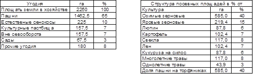 Исходными данными для проектирования являются структура земельных угодий (табл. 1.1)[1], структура посевных площадей (табл. 1.2)[1], урожайность сельскохозяйственных культур (табл. 1.3)[1], технологическая карта на возделывание с.-х. культуры (табл. 1.4)[1], нормативные материалы к определению объемов транспортной работы и номера группы хозяйства (табл. 1.5)[1].