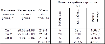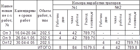 В календарном плане работы (табл. 3.2) по каждому трактору приводятся значения трех показателей (число рабочих дней, часы работы и расход топлива в кг). Часы работы определяются из технологической карты путем умножения количества нормо-смен (графа 14) на длительность смены (7 часов). Одновременно с заполнением календарного плана строится график использования тракторов. Отдельные работы по операциям откладываются в виде прямоугольников с их условными обозначениями. Основание прямоугольника соответствует календарному сроку выполнения данной работы, а высота прямоугольника–длительности рабочего дня в часах.