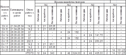 После уточнения выполненных расчетов по технологической карте производится составление календарного плана работы тракторов с одновременным построением и корректировкой графика их использования. По каждой марке тракторов первоначально принимаем ориентировочное их количество по наибольшему числу агрегатов, выполняющих одну из операций технологической карты. Разработку плана (табл.3,2) начинают с выписки наименований и объемов работ из технологической карты, выполняемых тракторами данной марки. Наименование работ можно указывать условными обозначениями соответствующими данной культуре и номеру (шифру) графа 1 табл. 2.2[1] операции по технологической карте.