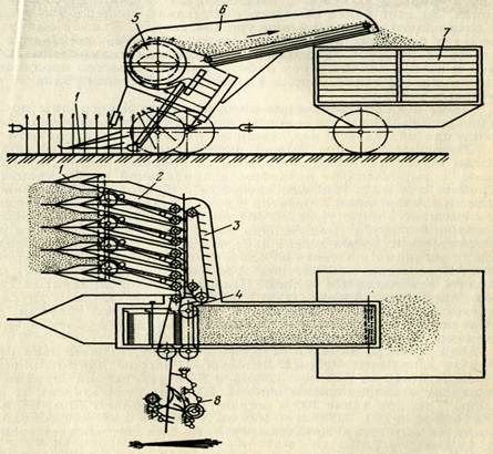Рис. 1 - Схема льнокомбайна ЛКВ-4А: 1-делитель; 2-теребильный аппарат; 3-поперечный транспортер; 4-зажимной транспортер; 5-барабан; 6-транспортер вороха; 7-тракторный прицеп; 8-вязальный аппарат