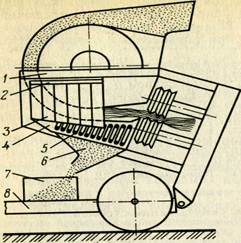 Рис. 2 - Схема приспособления для ликвидации потерь семян: 1-рама очесывающего барабана; 2-уголок; 3- фартуки; 4-выходной щиток; 5-пазы; 6-отводящий желоб; 7-дополнительный резервуар; 8-сница комбайна.