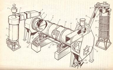 Рис. 3 - Зерносушилка СЗСБ-8: 1- вентилятор топки; 2 - топка; 3 - труба топки; 4 - труба горячего воздуха; 5 - загрузочное окно; 6 - загрузочная камера; 7 - патрубок ввода зерна; 8 - сушильный барабан; 9 - крестовина перелопачивания зерна; 10 - бандаж; 11 - труба вывода отработавшего воздуха; 12 - вентилятор разгрузочной камеры; 13 - разгрузочный элеватор; 14 - вентилятор охладительной колонки; 15 - труба вывода воздуха из охладительной колонки; 16 - охладительная колонка; 17 - труба контрольной сыпи; 18 - шлюзовой затвор охладительной колонки; 19 - камера разгрузки; 20 - шлюзовой затвор разгрузочной камеры; 21 - приемный ковш разгрузочного элеватора; 22 - приводные ролики барабана; 23 - вал роликов; 24- редуктор механизма привода роликов; 25 - клапан-мигалка