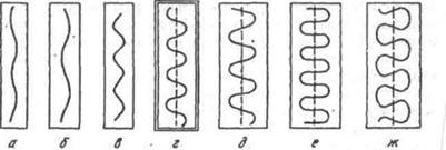 Различают форму и степень извитости. Форму извитости устанавливают по соотношению высоты дуги завитка и длины основания дуги. По этим показателям различают следующие формы извитости: гладкую — а, растянутую — б, плоскую — в, нормальную — г, сжатую — д, высокую — е, петлистую — ж (рис. 5).