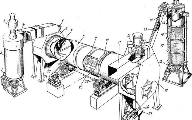 1 — вентилятор топки; 2 — топка; 3 — труба топки; 4— труба горячего воздуха; 5 — окно загрузочное; 6 – камера загрузочная; 7 — патрубок ввода зерна; 8 — барабан сушильный; 9 — крестовина с лопастями для перелопачивания зерна; 10 — бандаж; 11—труба для вывода отработавшего воздуха; 12—вентилятор разгрузочной камеры; 13 — элеватор разгрузочный; 14 — вентилятор охладительной колонки; 15—труба вывода воздуха из охладительной колонки; 16 — колонка охладительная; 17 — труба контрольной сыпи; 18 —шлюзовой затвор охладительной колонки; 19 — камера разгрузочная; 20 — шлюзовой затвор разгрузочной камеры; 21 — приемный ковш разгрузочного элеватора; 22 — приводные ролики барабана; 23 — вал роликов; 24 — редуктор механизма привода роликов; 25—клапан-мигалка.