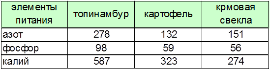 Дозы внесения органики зависят от региона и состояния почвы. Дозы внесения минеральных удобрений для посадок топинамбура принимаются из расчета потребности культуры в питании. Вынос элементов питания топинамбуром при средней его урожайности в 1,5 -2 раза большое по сравнению с картофелем или свеклой (таблица 4).