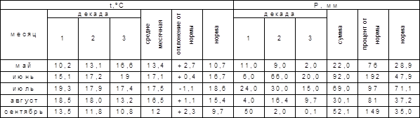 Более полно характеризует погодные условия летнего периода – гидротермический коэффициент (ГТК), который включает в себя одновременно температуру (t,оС) и осадки (Р, мм).